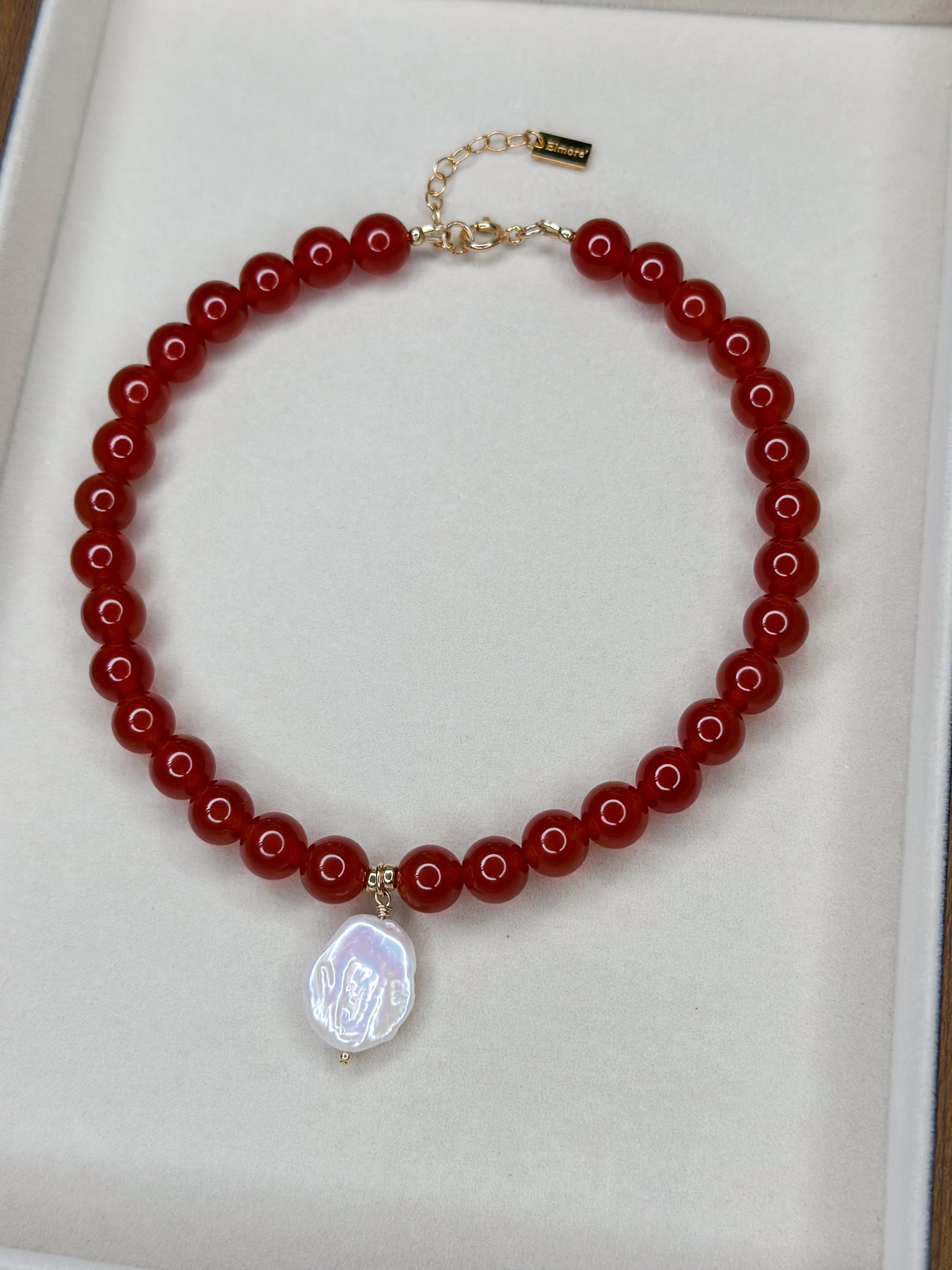 שרשרת המיוצרת בעבודת יד מאבני קרנליאן טבעיות בגוונים חמים של כתום–אדמדם עם שילוב של תיליון פנינה טבעית וסוגר גולדפילד🤍