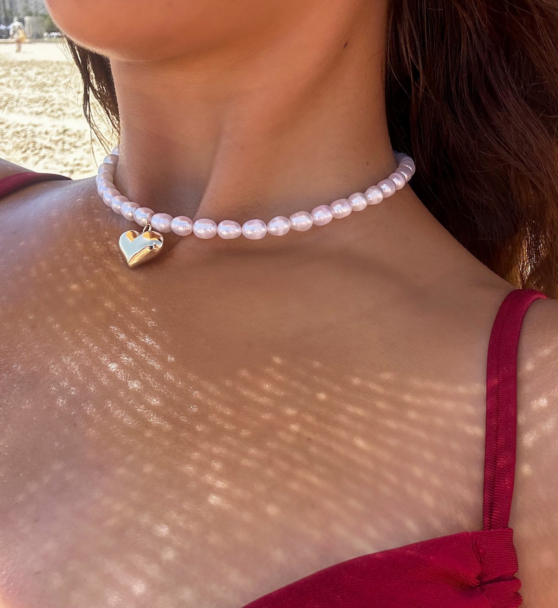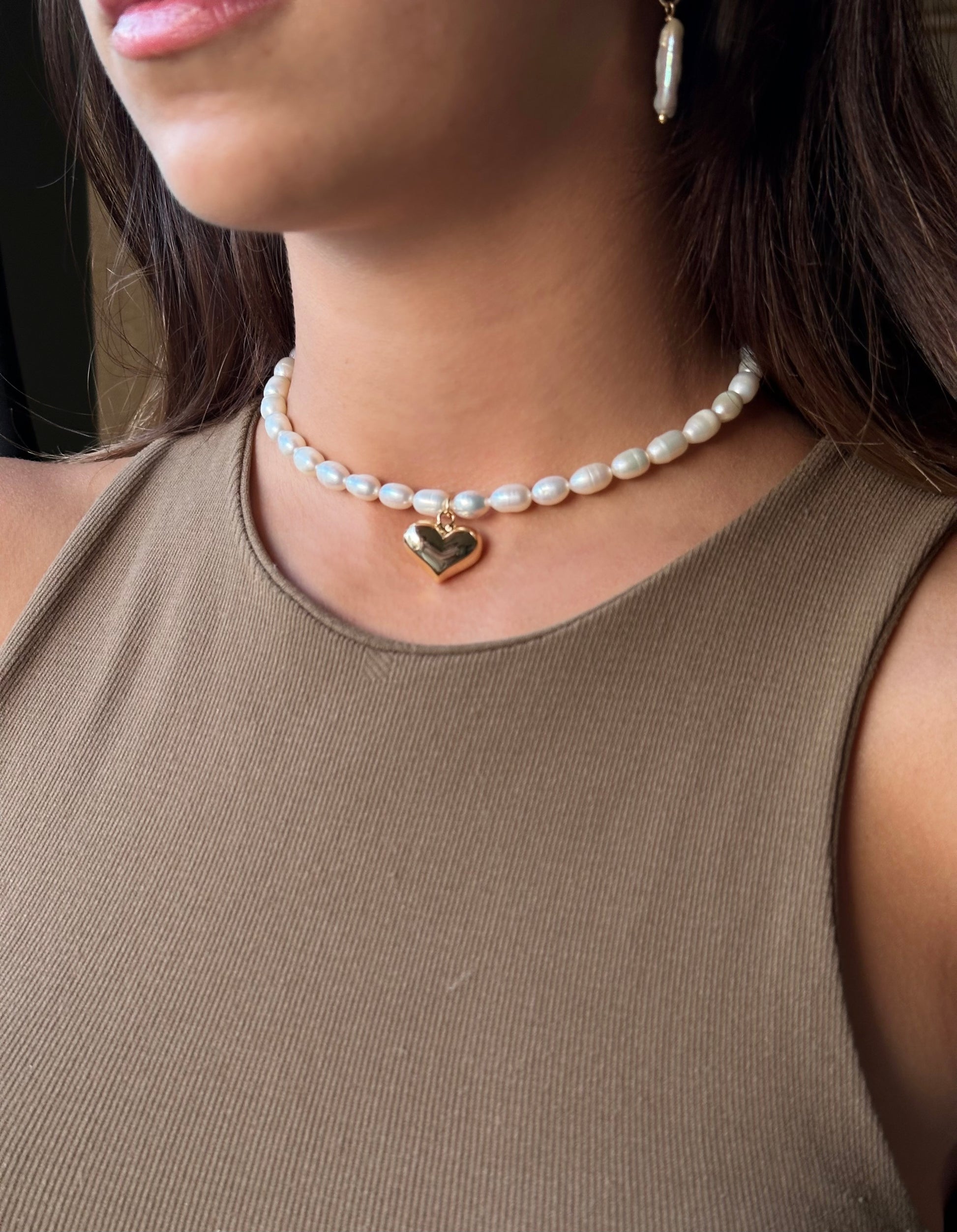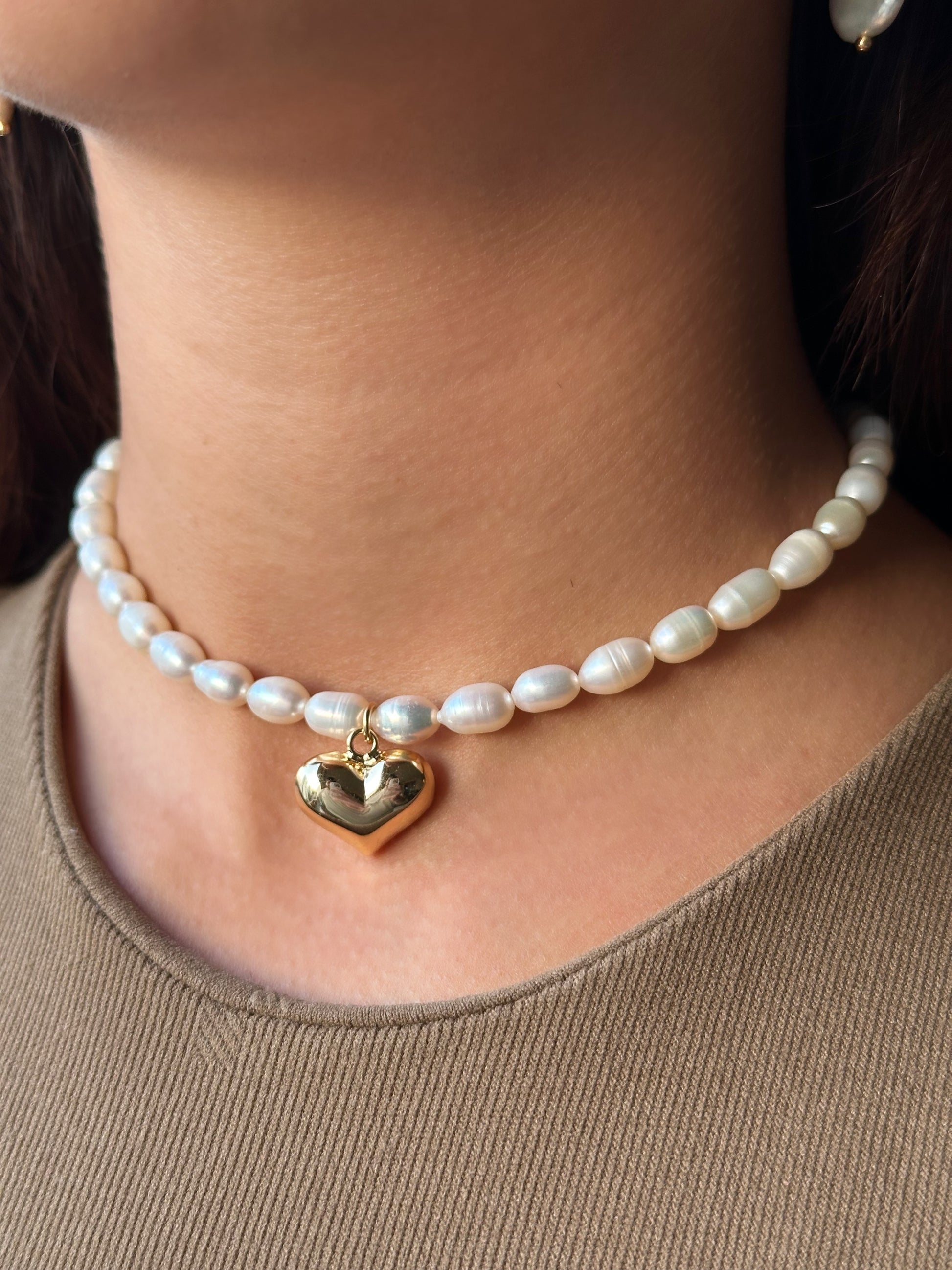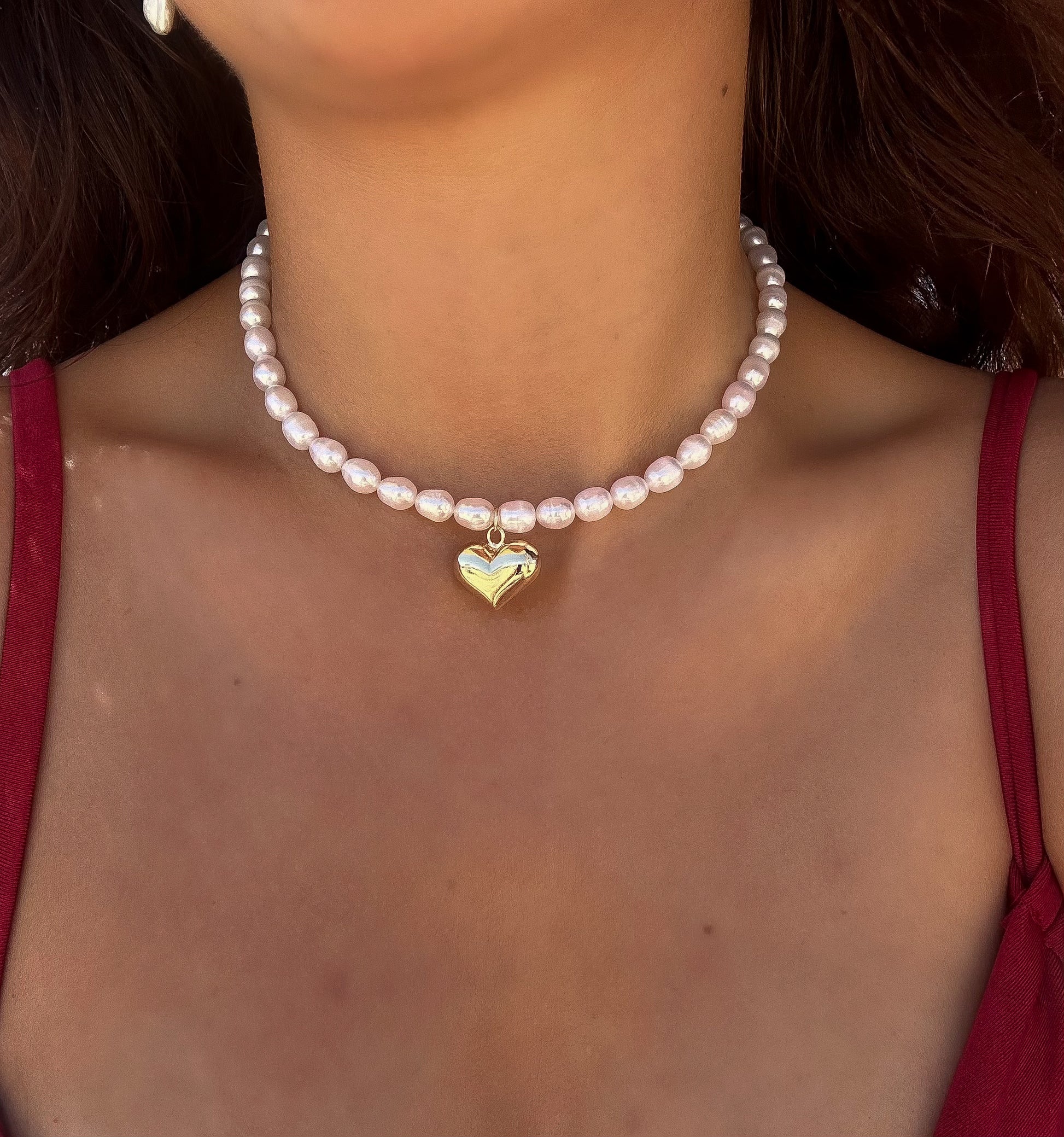 שרשרת בעבודת יד, עשויה פניני מים מתוקים טבעיות עם תליון לב עדין בציפוי זהב 14 קראט וסוגר מוזהב בגולדפילד ✨